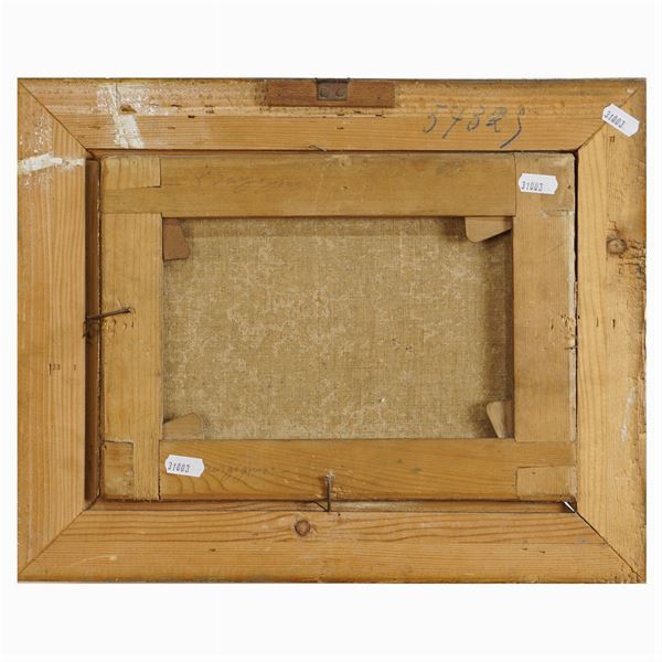 23x31 cm."Scena di battaglia", olio su tela, entro cornice in legno dorato