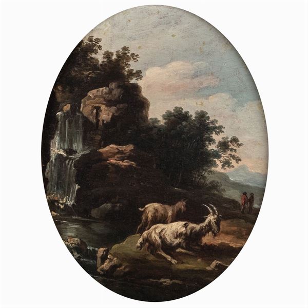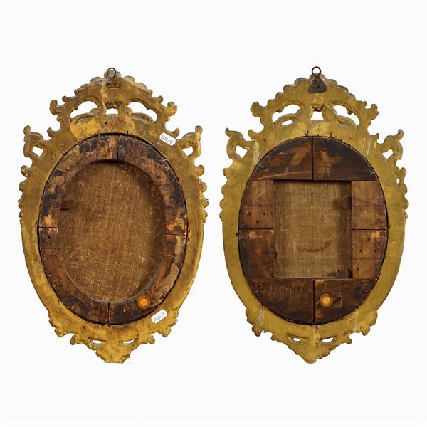 29x22,5 cm."Campagna romana", coppia di oli su tela, entro cornici in legno dorato ed intagliato