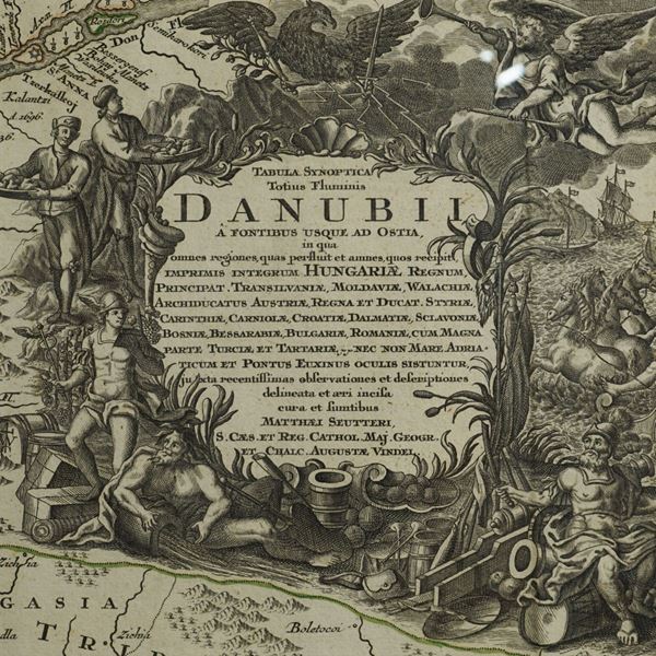 51x172 cm."Tabula synoptica totius fluminis Danubii", stampa acquarellata, entro cornice