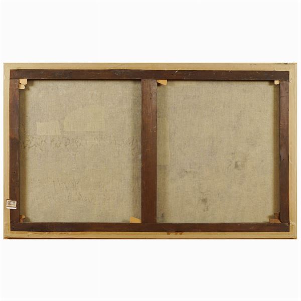 92x152 cm."Paesaggio con figure", olio su tela, firmato in basso a sinistra, entro cornice