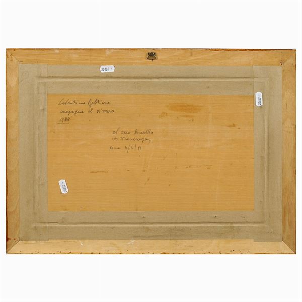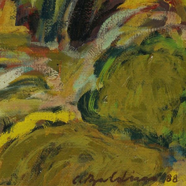 "Campagna al vivaro", 1988, olio su cartoncino telato, firmato e datato in basso a destra, entro cornice