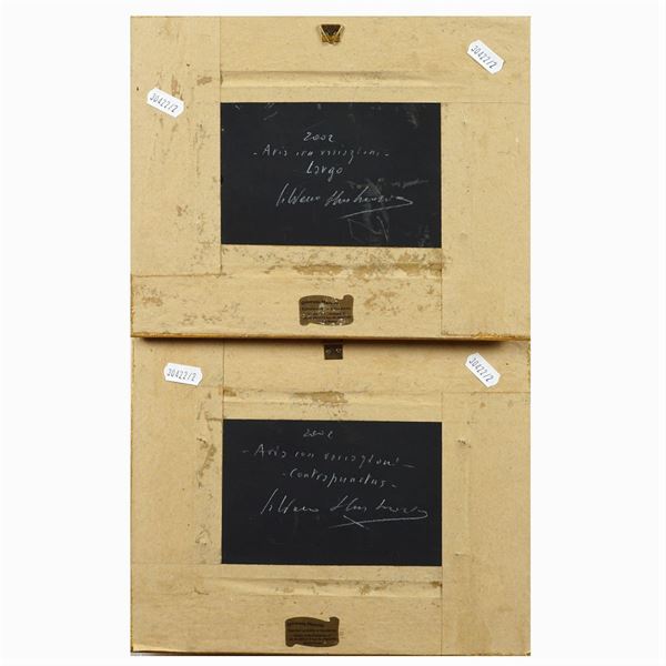 12x17 cm."Aria con variazioni, Largo - Contrapuctus", 2002, due olii su ardesia, firmati, datati e titolati sul retro, entro cornici