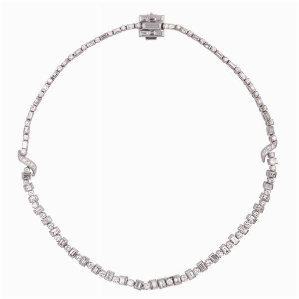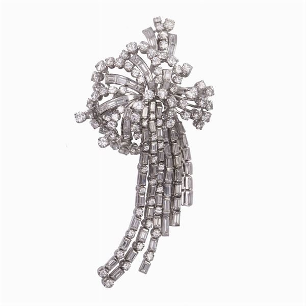 peso 79 gr.taglio brillante e baguettes ct 20 circa, pendente centrale a spilla removibile, lunghezze 40,5 cm. - 37 cm. senza centrale