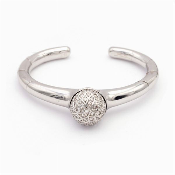 peso 51 gr.in oro bianco 18kt sormontato da sfera in oro bianco e diamanti taglio brillante ct 1 circa, diametro 6 cm.