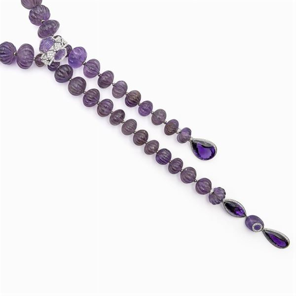 peso 700 gr.composta da saliscendi con ametiste tagliate a melone, fermezza e pendenti in oro bianco 18kt ametiste a goccia ed incise e diamanti taglio brillante