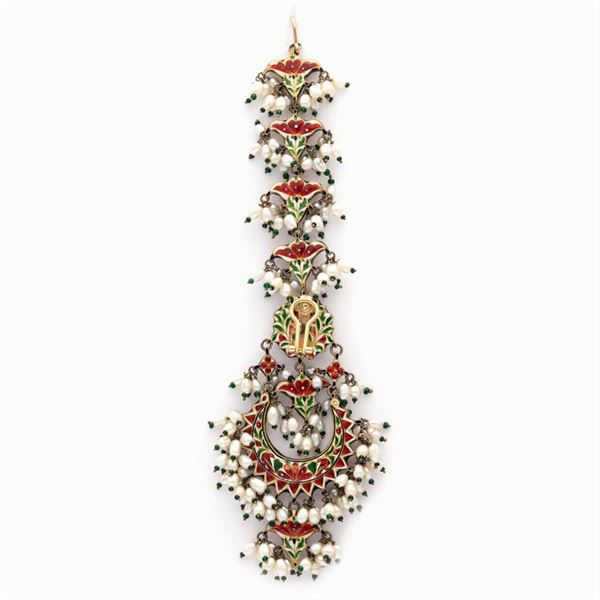 peso 142 gr.realizzati in argento placcato e oro giallo 18kt con incastonate pietre a simulare rose di diamante, rubini, smeraldi taglio fantasia e perline pendenti, il retro interamente decorato a motivo floreale in smalto policromo, lievi difetti, lunghezza 16 cm.