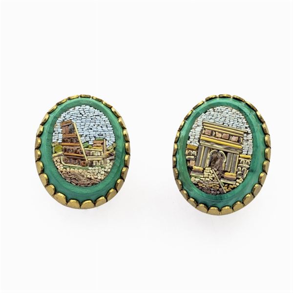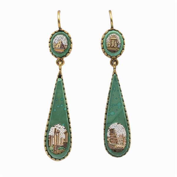 peso 65 gr.composta da una collana e due paia di orecchini pendenti e a lobo, venti placche di micromosaico su malachite disposte a gradazione e montate in princisbecco, difetti e restauri, lunghezza collana 44 cm. orecchini 5 e 2 cm.