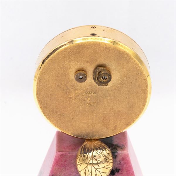 misure 10x5,5x4 cm.in oro giallo 18kt, cassa tonda 49 mm. quadrante bicolore in giadeite con numeri romani, base a parallelepipedo realizzata in oro giallo e rodocrosite poggiante su quattro piedini a sfera, movimento meccanico a carica manuale, cassa, quadrante e movimento firmati