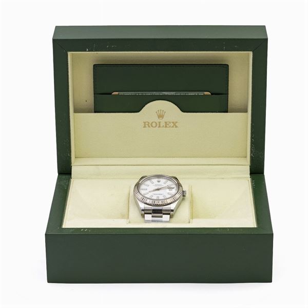 in acciaio, ref. 116334 - cassa tonda 41 mm. quadrante bianco con indici luminescenti, datario ore 3, ghiera zigrinata in oro bianco 18kt, vetro zaffiro, movimento meccanico a carica automatica, bracciale oyster in acciaio con chiusura deployante, cassa, quadrante e movimento firmati, completo di scatola e garanzia