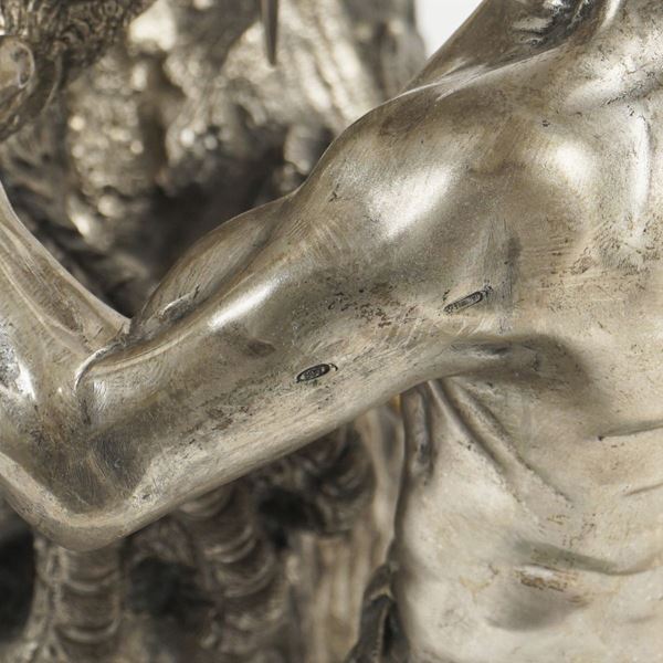 Al centro si erge la figura di Ercole, vestito di pelle di leone, che brandisce una mazza per colpire Idra, mostro a nove teste disposte a formare i bracci per le candele, base rocciosa con conchiglie, erbe e creature marine su supporto in malachite, sul fusto si arrampica Iolao che attacca Idra con un pugnale