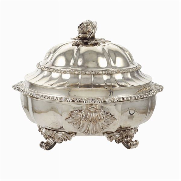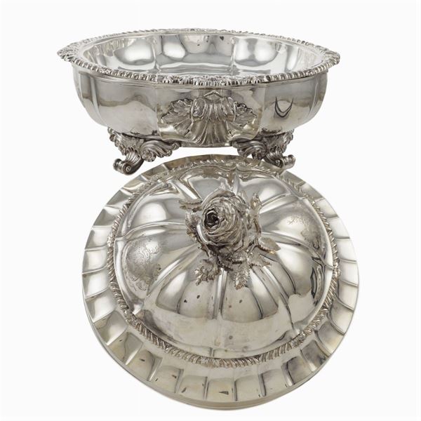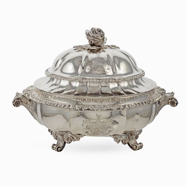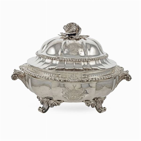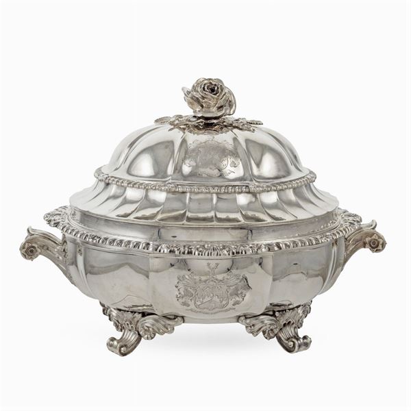 23,5x34x29,5 cm.orafo William Elliot, a sezione circolare con due manici a doppia voluta, corpo liscio baccellato ed inciso con stemmi araldici, profili godronati, presa del coperchio a foggia di rosa, poggianti su quattro piedini a voluta, contenitore interno in argento, peso complessivo 15836 gr.