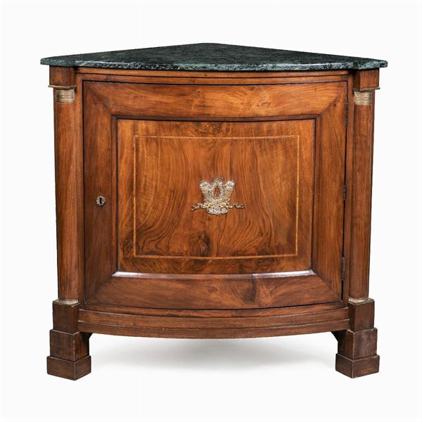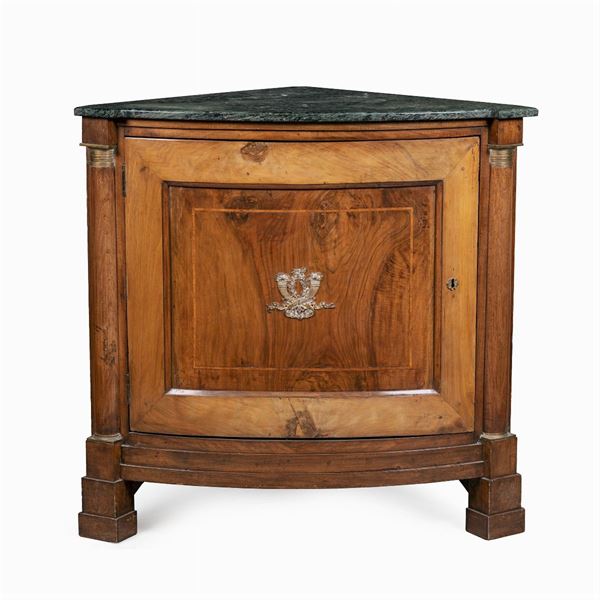 105x74x74 cm.fronte ad uno sportello delimitato da colonnine, applicazioni in bronzo dorato, piani in marmo verde Alpi non coevi, modifiche e rifacimenti della struttura