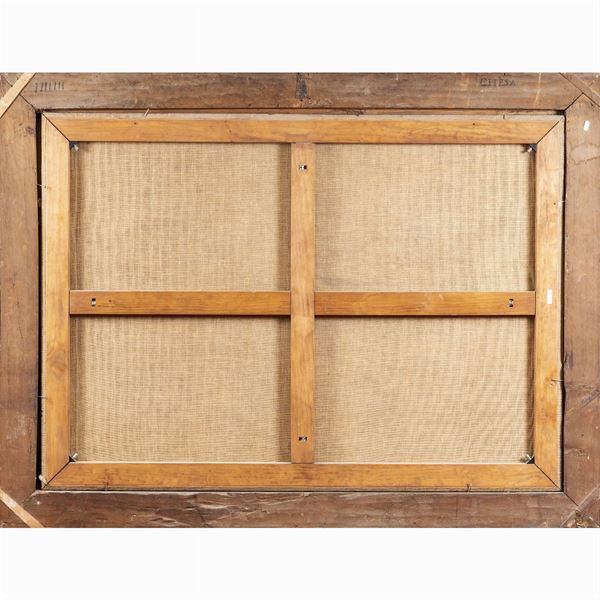 94x131 cm."Natura morta con un cane maltese, un pappagallo, un orologio, una spada e una parrucca", olio su tela, entro cornice in legno dorato