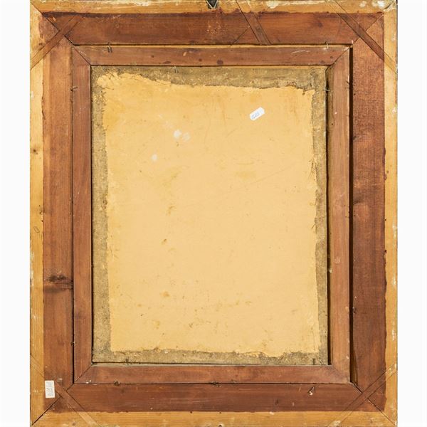 48,5x38,5 cm."Profilo femminile", olio su tela applicata su cartone, firmato in basso a sinistra, entro cornice