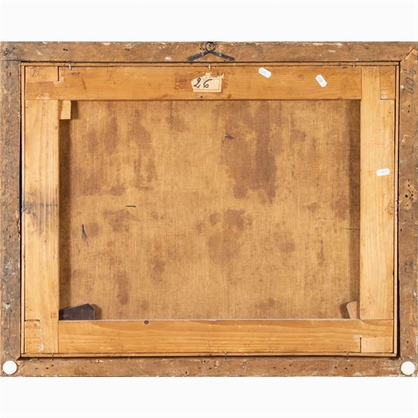 56,5x72,5 cm."Scena di battaglia", olio su tela, entro cornice in legno dorato