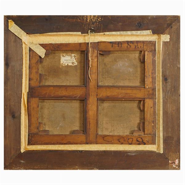 44x53 cm."Scena di caccia", olio su tela, entro cornice in legno dorato