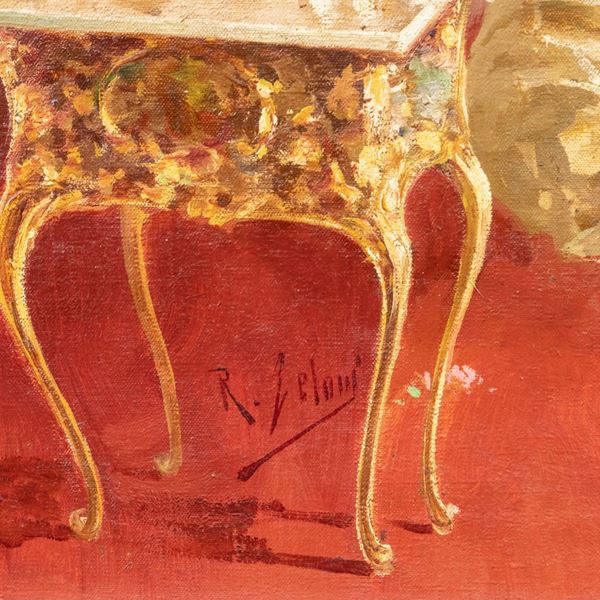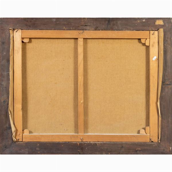 65x83 cm."Scena d'interno con figure", olio su tela, firmato in basso a sinistra, entro cornice