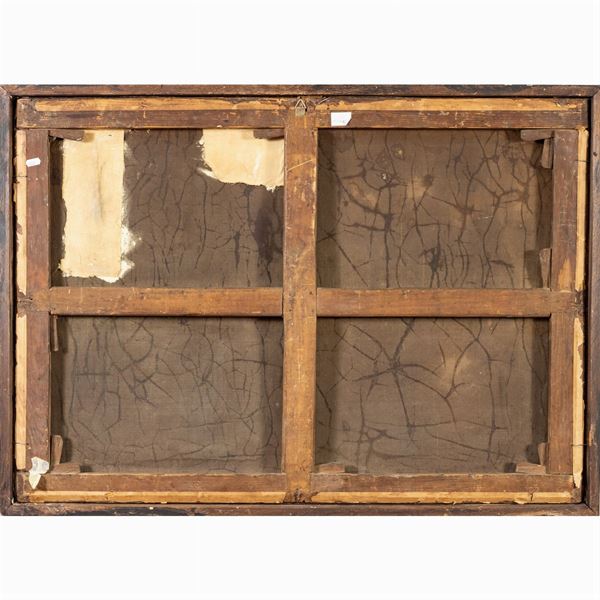 72x101 cm."Scena galante con sfondo di paesaggio", olio su tela, entro cornice