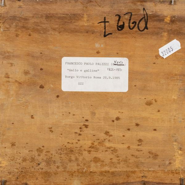 21x27 cm."Gallo e galline", olio su tavola, reca firma Francesco Paolo Palizzi in basso a destra, entro cornice