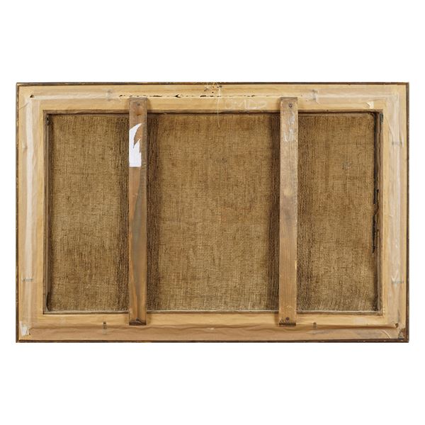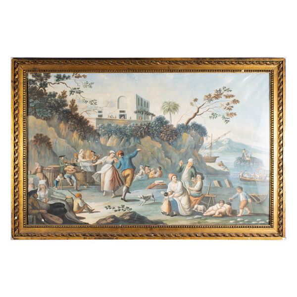 51x81 cm."Scena di festa popolare con figure danzanti", tempera su carta applicata su tela, entro cornice in legno dorato
