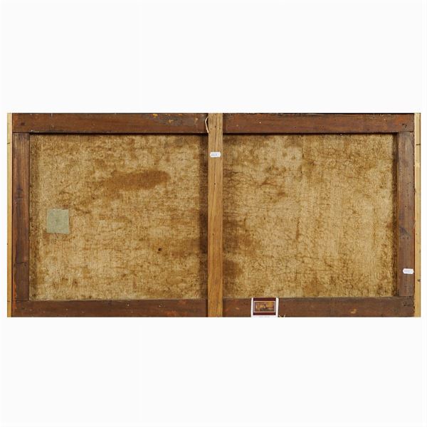 49x95 cm."Paesaggio con rovine e pescatori", olio su tela, entro cornice