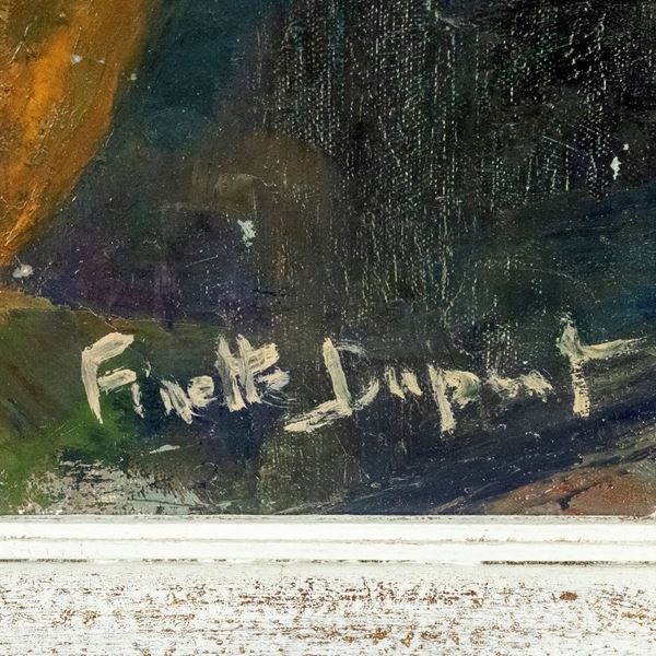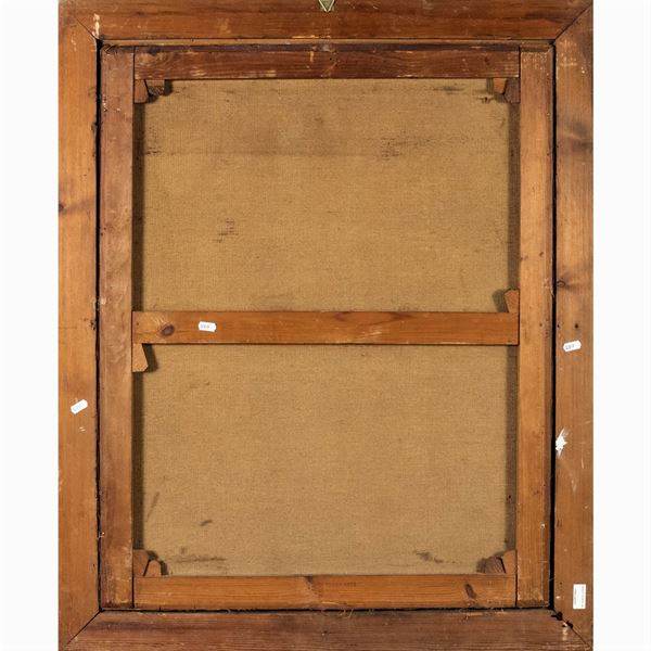 81x66 cm."Natura morta con brocca di fiori", olio su tela, firmato in basso a destra, caduta di colore in basso al centro, entro cornice