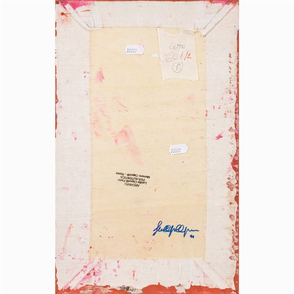 40x25 cm."Senza titolo", tecnica mista su tela applicata su tavola, firmata sul retro con timbro Archivio Lucilla Caporilli Ferro, per autentica Memmo Caporilli, Roma