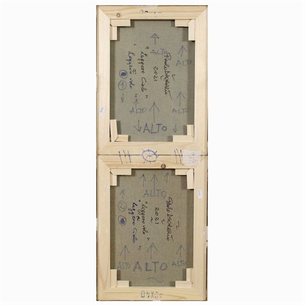 30x80 cm."Leggero cielo - Leggero volo", 2021, dittico acrilico su tela, firmato, datato e titolato sul retro, entro cornice