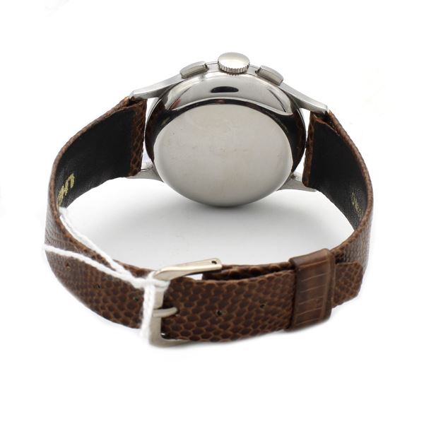 in acciaio, cassa tonda 33 mm. quadrante argentato con numeri arabi dorati, scala tachimetrica e telemetrica, due quadranti ausiliari per contatore, movimento meccanico a carica manuale, cinturino in pelle con fibbia in metallo