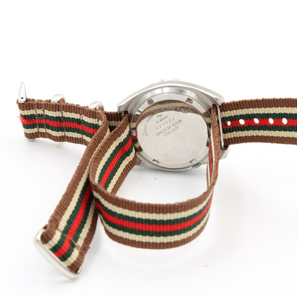 in acciaio cromato, cassa di forma 38x42 mm. quadrante marrone con indici, datario ore 3, ghiera marrone, movimento meccanico a carica automatica, cinturino in tessuto con fibbia in metallo