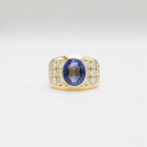 peso 16 gr.zaffiro taglio ovale briolet ct 3,90 circa, ai lati diamanti taglio brillante ct 1,90 circa colore G/H - purezza IF/VVS, misura 14,5 completo di certificato gemmologico