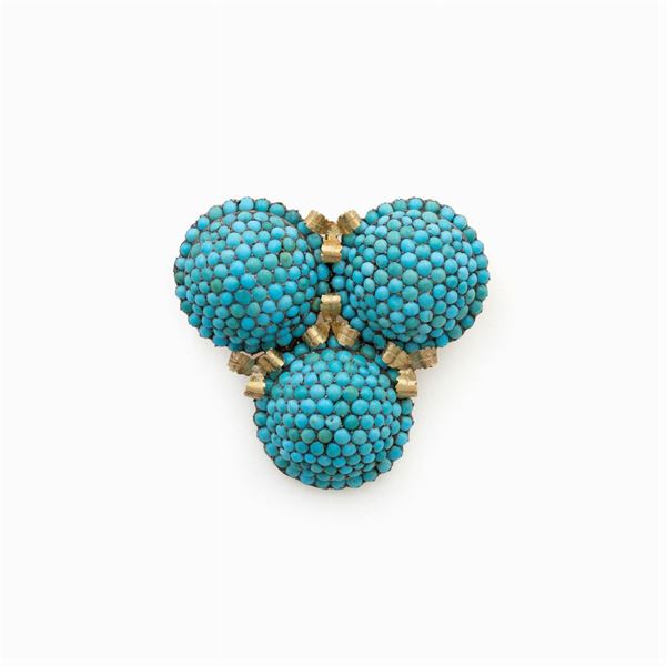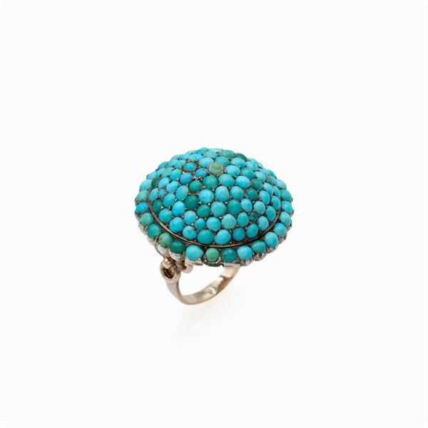 peso 45 gr.in oro e argento con turchesi naturali taglio cabochon, lievi difetti, misure spilla 4,6x4,8 cm. - anello 9
