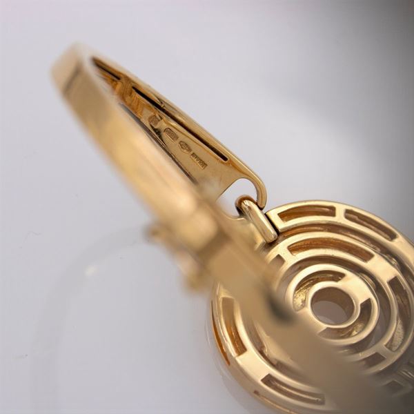 peso 57 gr.composta da bracciale a manetta e orecchini pendenti in oro giallo 18kt, bracciale diametro 5,5 cm. - orecchini lunghezza 3,5 cm.