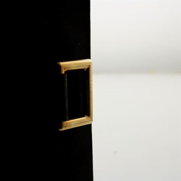 misure 22x12,5x5,5 cm.in pelle di daino nero, chiusura a scatto in oro giallo 18kt e zaffiri taglio cabochon, finiture in pelle nera, interno ad uno scomparto con tre tasche, una tasca esterna anteriore, condizioni buone
