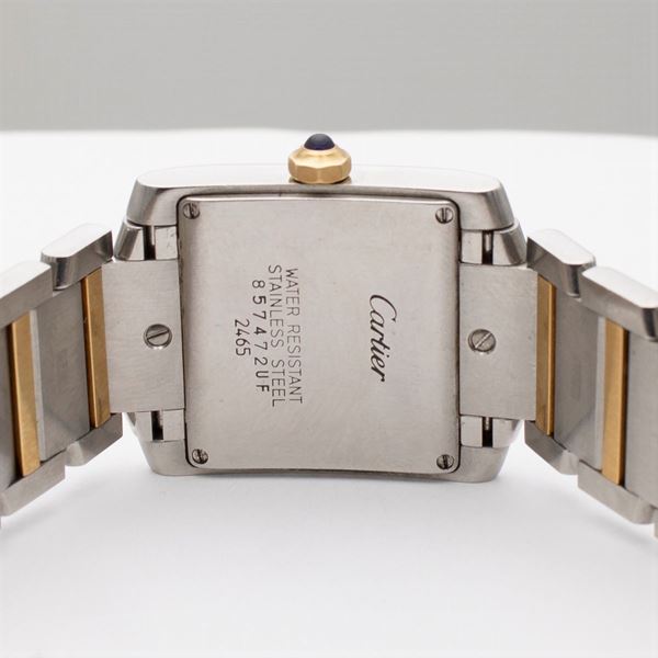 in acciaio e oro giallo 18kt, ref. 2465 - 857472UF, cassa carré 30x25 mm. quadrante grené argentato con numeri romani, datario ore 3, vetro zaffiro, movimento al quarzo, bracciale in acciaio e oro con chiusura deployante, cassa, quadrante e movimento firmati, completo di scatola