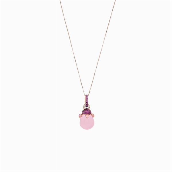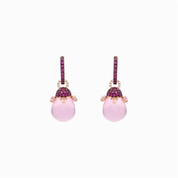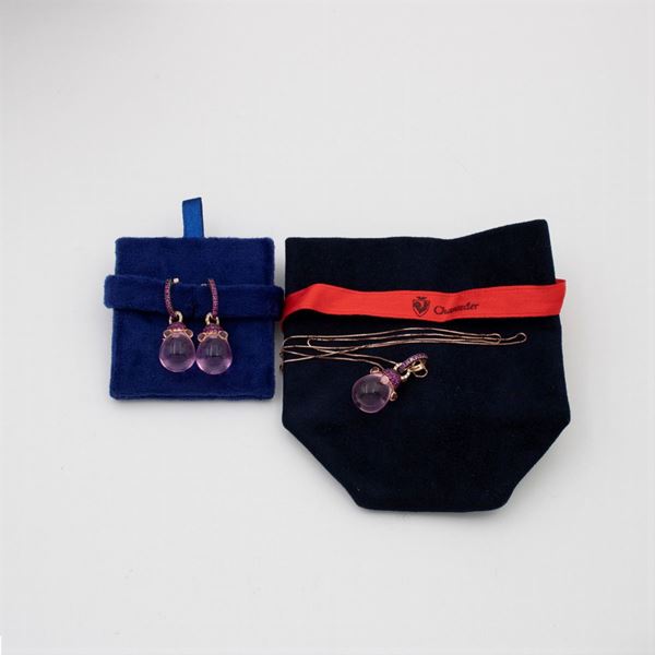 peso 17 gr.composta da orecchini e pendente completo di collanina in oro rosa 18kt, diamanti taglio brillante, zaffiri rosa e goccia in cristallo rosa, lunghezza orecchini