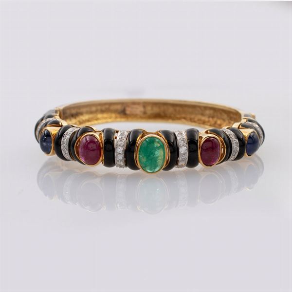 peso 39 gr.in oro giallo 18kt smalto nero, nella parte superiore incastonati smeraldo, rubino e zaffiri taglio ovale cabochon alternati da diamanti taglio brillante ct 0,80 circa, chiusura a scatto, diametro 5,5 cm.