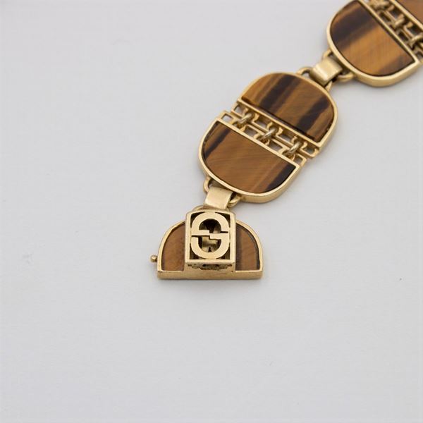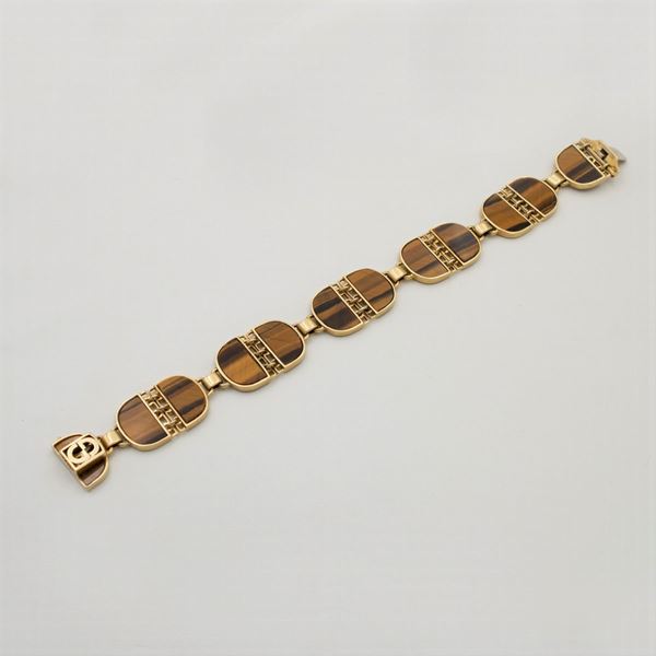 peso 31 gr.in oro giallo 18kt con elementi a semiluna in occhio di tigre, chiusura a scomparsa, lunghezza 18 cm. completo di scatola