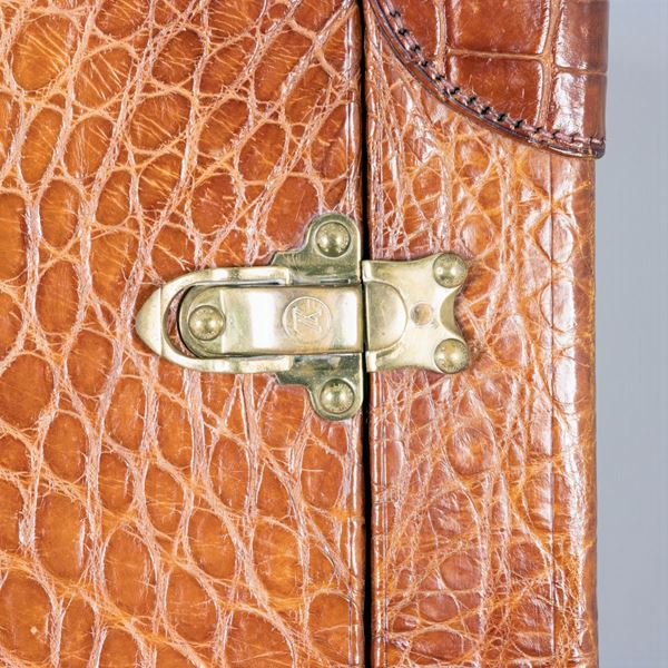 in coccodrillo marrone, finiture in pelle e ottone dorato, interno in pelle verde a due scomparti con divisore removibile e cinghie in pelle, tre chiusure a lucchetto di cui la centrale con chiavi, manico rigido in coccodrillo, completa di custodia originale in tessuto e coccodrillo che presenta segni di usura