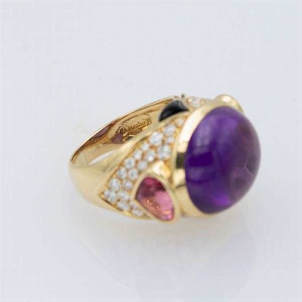 peso 12 gr.in oro giallo 18kt con ametista taglio cabochon, lievi difetti, ai lati due zaffiri rosa taglio briolet, diamanti taglio brillante ct 1,30 circa e onice nero, misura 12,5