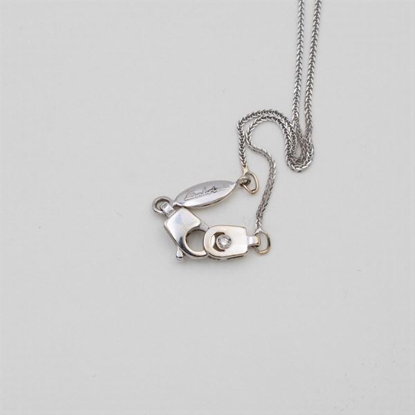 peso 11 gr.zaffiri taglio tondo ct 0,40 circa e diamanti taglio brillante ct 0,70 circa, misure 4x3 cm. completo di collanina in oro bianco 18kt lunghezza 45 cm.
