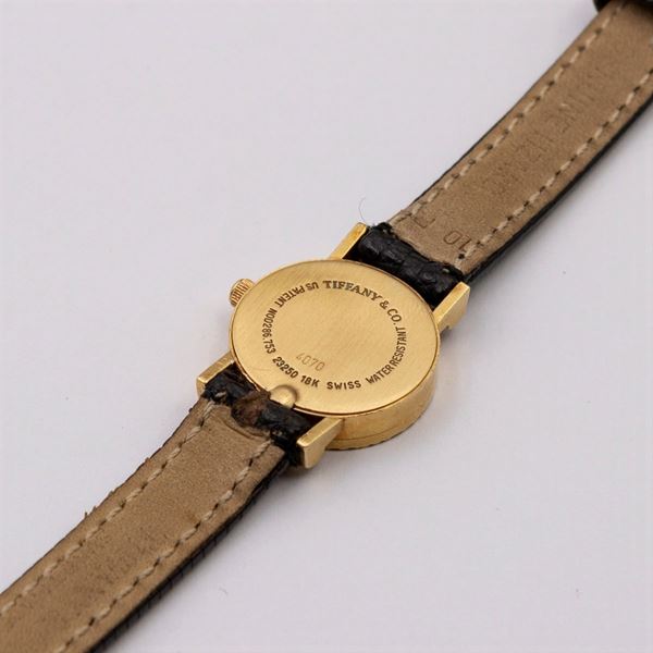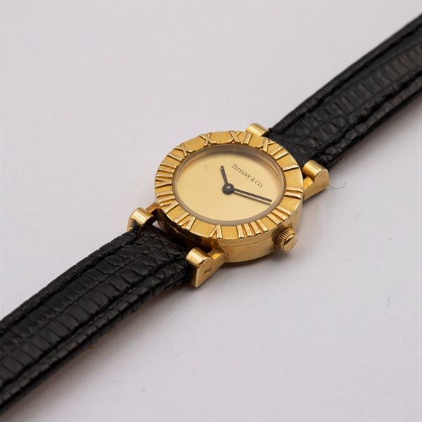 in oro giallo 18kt, ref. 23250 - 286.753, cassa tonda 19 mm. quadrante dorato, vetro zaffiro, ghiera con numeri romani, movimento al quarzo, cinturino in pelle con fibbia originale