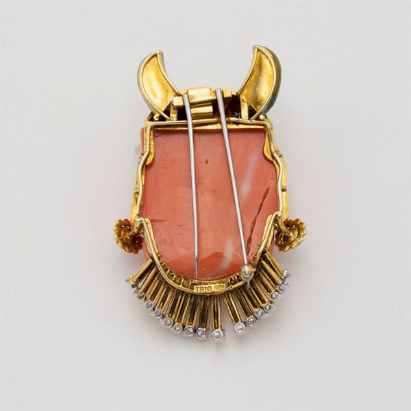 peso 36 gr.scolpito, montata in oro giallo 14kt, zaffiri taglio cabochon, turchesi naturali e frangia con elementi snodabili in oro giallo e diamanti taglio brillante ct 0,50 circa, misure 6x4 cm.