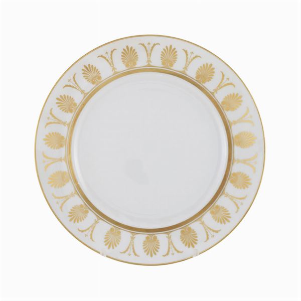 decoro "Pompei oro" in porcellana su fondo bianco e decoro dorato, marchio della produzione.