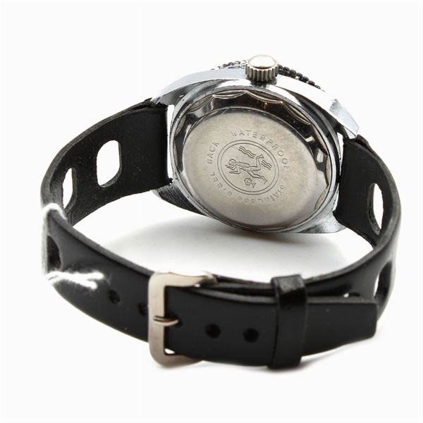 in acciaio, cassa tonda 36 mm. quadrante fumé con indici e numeri arabi, datario ore 3, contasecondi centro, movimento meccanico a carica automatica, bracciale in pelle con fibbia in metallo
