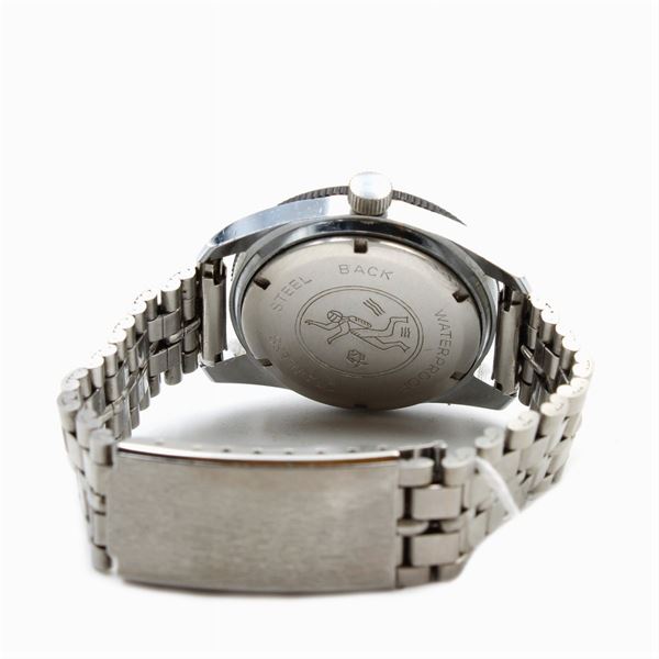 in acciaio cromato, cassa tonda 36 mm. quadrante nero con numeri arabi luminescenti, contasecondi ore 6, ghiera girevole, movimento meccanico a carica manuale, bracciale in acciaio con chiusura deployante