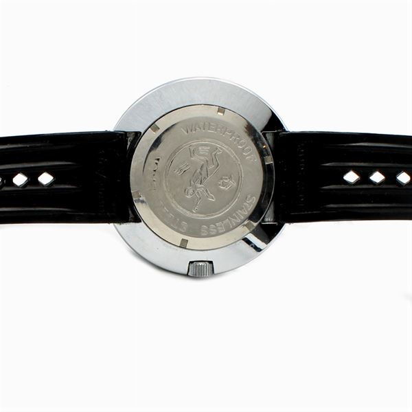 in acciaio cromato, cassa tonda 43 mm. quadrante racing marrone con indici arancio, datario ore 3, ghiera girevole con scala tachimetrica, movimento meccanico a carica manuale, cinturino in gomma con fibbia in metallo