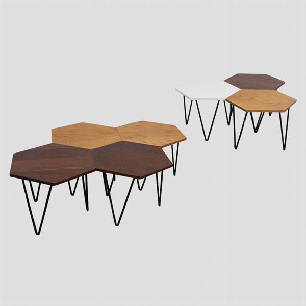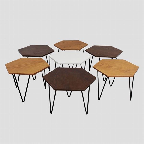 sette tavolini in legno e metallo verniciato, etichetta della produzione.