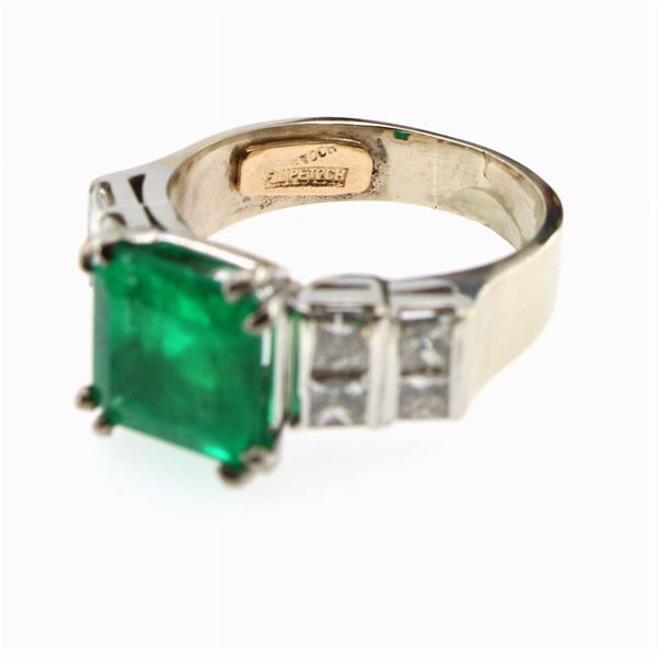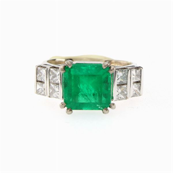 peso 19 gr.ct 2,51 circa, ai lati diamanti taglio carré e princess ct 1 circa, colore G - purezza IF/VVS, misura 8, completo di astuccio e certificato gemmologico