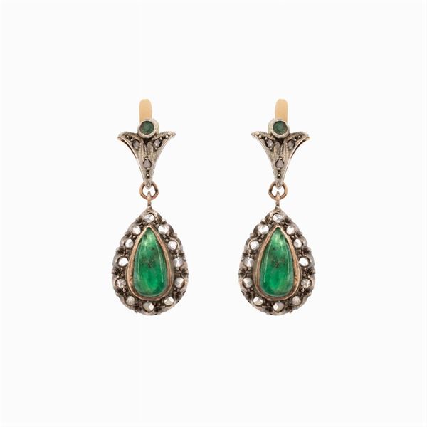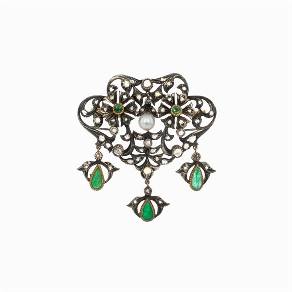 rose diamante, smeraldi tondi e a goccia composta da spilla con pendenti dimensione 6,3x6,2 cm. e orecchini pendenti lunghezza 3,5 cm.